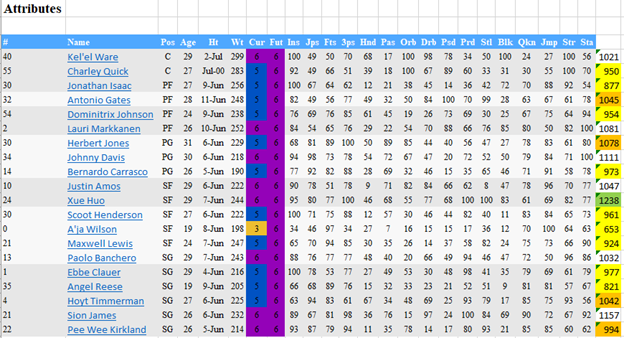 Second, I took the average of all these players, which comes out to 44. There are currently 8 players that fall below this average number. Now I can’t tell you what this means, but this shows where your player may fall in line with the other purple players. An example being my player, Justin Amos has a 43, which puts him below average in terms of all purple players, but he is the 2nd best SF behind Xue (who is a freak by the way, but we will get to him), so that’s actually not bad in the grand scheme of things.