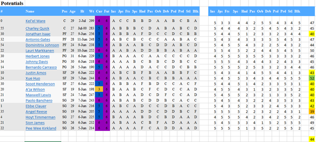 There are a few exceptions to point out, they are in orange. First one to note is Pee Wee Kirkland, he is currently the only P/P to be under the 1,000-point threshold. Next are Hoyt Timmerman, Herb Jones, and Antonio Gates. These 3 players are currently B/P but have reached that 1,000 threshold. Looking at their potential numbers Antonio is a 47 in Potential, Herb and Hoyt are both 46, so all 3-above average. Antonio and Hoyt are both late 20’s, but Herb is over prime into 31. My educated guess here is Antonio and Hoyt might hit P/P soon as they are both in range on the previous categories, and I can’t see the history to know of Herb used to be P/P or not, but my guess for him is that he might not ever reach it.