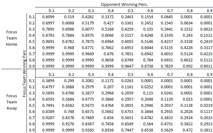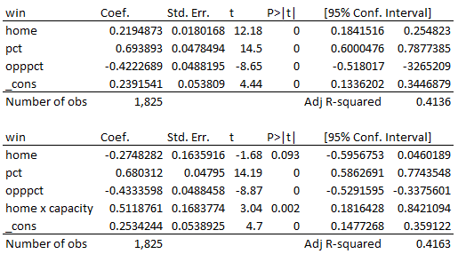 Now this is where things get really interesting. Using the same simple model, it seems like it produces similar results (see top table below). Being at home improves the probability of winning by about 22 percentage points, although there is more asymmetry in the effect of focus team winning percentage and opponent winning percentage. When I add the capacity-home interaction things get crazy. Being at home now has an insignificant though suggestively negative result and capacity is positive and significant. Does this mean there is a home court disadvantage in the playoffs? Not really, looking at the magnitude of the estimates, as long as the home team fills over 50% of the house, there is still a positive effect. It does suggest that home court advantage in the playoffs has to be gained by filling the seats and, with a full house, is likely stronger than during the regular season by improving the probability of winning by about 24 percentage points.