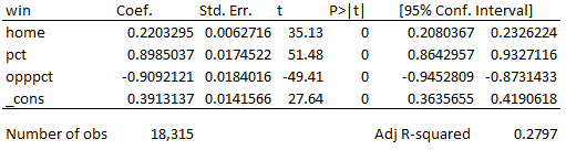 Yes, at least in the regular season. First off, it is worth noting that I excluded games played in April because good teams may not be trying to win in much of April. I also exclude November because using winning percentage as a measure of team quality may be inaccurate at that point in the season. I also fail to account for some important things like how well the teams match up and injuries. Running a linear probability model with a binary variable for winning as the dependent variable indicates that playing at home improves a team's probability of winning that game by about 22 percentage points. The estimate is pretty precise with a confidence interval ranging from 20.8 percentage points to 23.3 percentage points. Using a logit model to account for the binary dependent variable produces similar results, though they are not as easily interpreted. It is also worth noting the estimates for the effect of team strength on winning a game. It is kind of difficult to describe the effect in words so I just made a prediction table so you can get a feel for how much the strength of an opponent relative to the focus team matters. Does attendance matter?